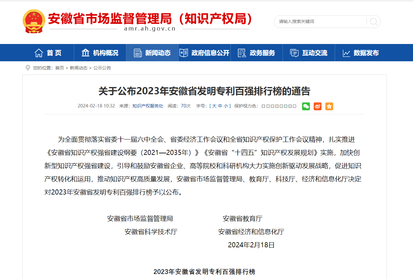 2024年2月18日,安徽省市場監督管理局,安徽省教育廳,安徽省科學技術廳,安徽省經濟和信息化廳聯合發布了“安徽省發明專利百強排行榜”中,公司在全省高校、科研院所、企業中脫穎而出,再次榮登發明專利百強,這是自2014年排行榜創立以來,公司第8次上榜。