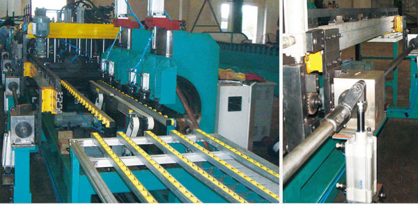根據(jù)要求各專機(jī)可組合完成對(duì)定心板料的自動(dòng)上料、沖孔切邊、輥軋成型、切斷、臺(tái)階壓型、兩端90度折彎、單側(cè)90度折彎、機(jī)械手自動(dòng)送料、下料等工序。