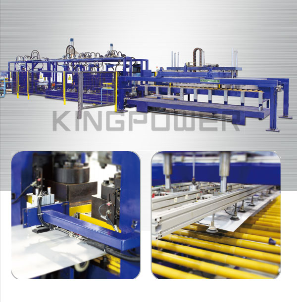 根據(jù)產(chǎn)品需要各專機(jī)可任意組合,完成對定尺板料的自動上料、沖孔切邊、料片翻轉(zhuǎn)、輥軋成型、疊Z成型包邊、臺階孔沖翻與端折、冷凝器貼覆、U型折彎、下料等工序。
