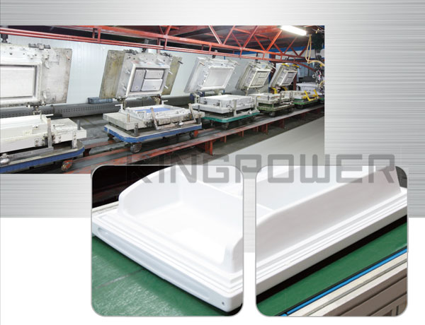 該發泡線由鏈式驅動系統、發泡夾具、烘爐、發泡機平臺、蒸汽加熱及抽風系統、充注機械手、開鎖機構、輸送臺車、開合蓋導軌、輔助鎖模裝置以及配套氣動系統、液壓系統、電控系統等部分組成。該發泡線主要手(自)動上箱(門)、夾具合模、手(自)動垂直充注、循環驅動、加熱固化循環、夾具開鎖、夾具打開、手(自)動下箱(門)、清泡等工序組成。