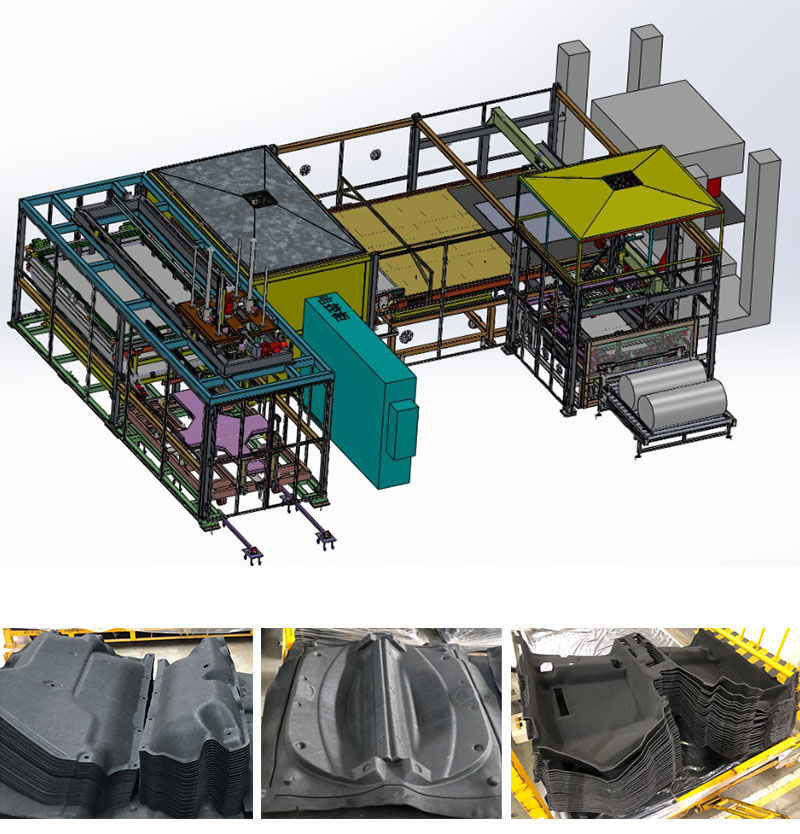 材料采用自動上料,可使用兩種材料分別加熱后在壓機工位成型,材料取件在壓機工位完成,整機僅需一人操作即可。