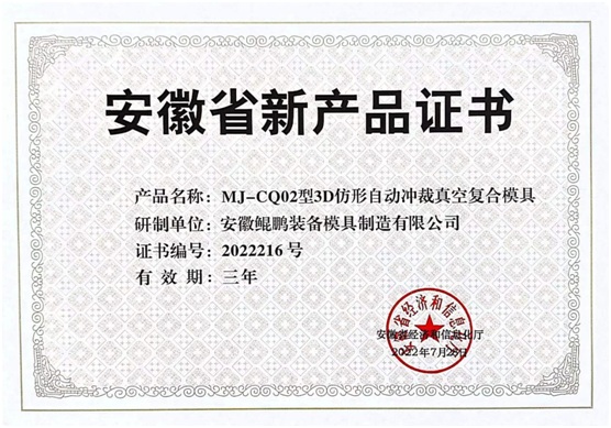 繼4月份的兩件省級新產品后,我公司的“3D仿形自動沖裁真空復合模具”、“冰柜內膽高柔性鈑金設備”于7月28日獲得了安徽省經濟和信息化廳頒發的安徽省新產品證書。公司目前累計獲得各級新產品認定共22項