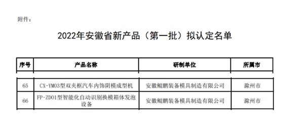 4月12日,安徽省經濟和信息化廳公布的113項省級新產品名單中,我公司的“雙夾框汽車內飾陰模成型機”、“智能化自動識別換模箱體發泡設備”通過了認定。截止目前,公司累計獲得新產品認定20項。