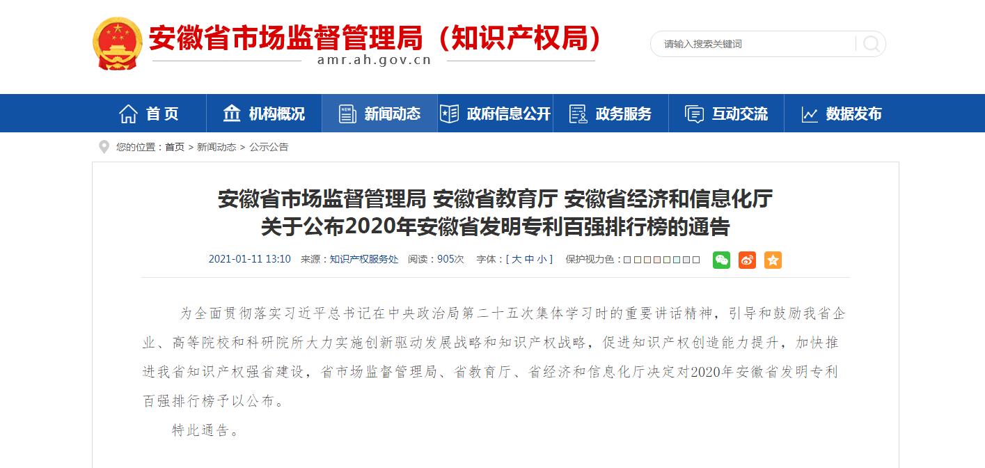 1月8日,安徽省市場監督管理局、省教育廳、省經濟和信息化廳聯合公布了2020年安徽省發明專利百強排行榜,我公司再一次榮登百強排行榜。這也是我公司從2017年起,連續第四年進入安徽省發明專利年度百強排行榜。