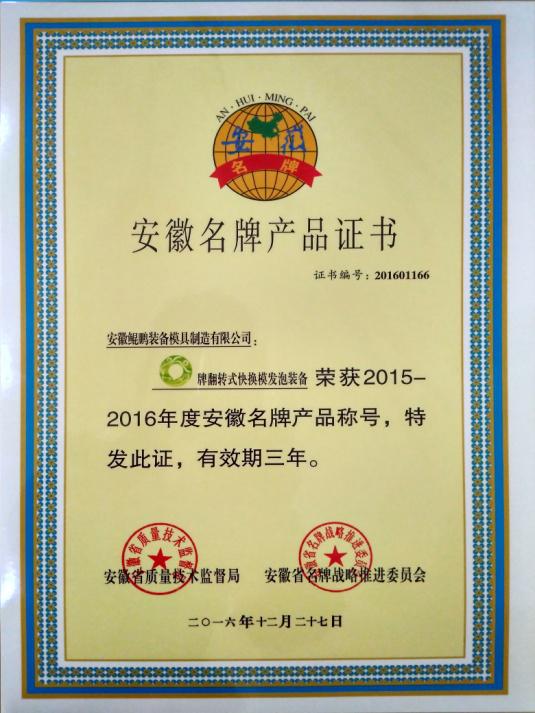 我公司產品鯤鵬牌翻轉式快換模發泡裝備榮獲2015-2016年度安徽省名牌產品稱號,這是我公司繼鯤鵬牌塑料真空成型機榮獲省名牌產品后,再次榮獲此榮譽。
