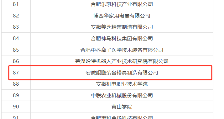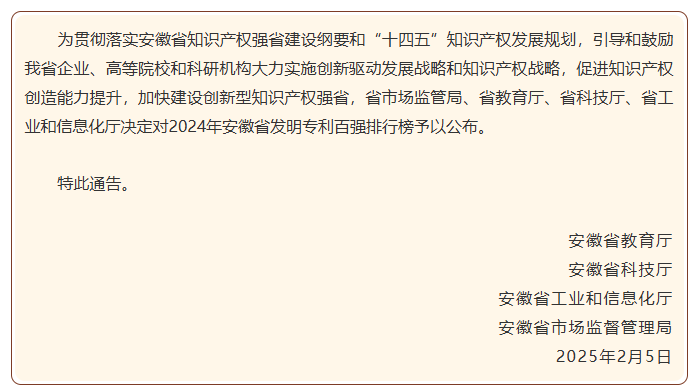 2025年2月5日,安徽省市場監督管理局,安徽省教育廳,安徽省科學技術廳,安徽省工業和信息化廳聯合發布了“安徽省發明專利百強排行榜”,我司在全省高校、科研院所、企業中脫穎而出,連續9年榮登發明專利百強榜。公司現已累計授權超過千項專利,其中授權發明專利175項。https://mp.weixin.qq.com/s/K32RLsycn2k1YNE_9c7kmg